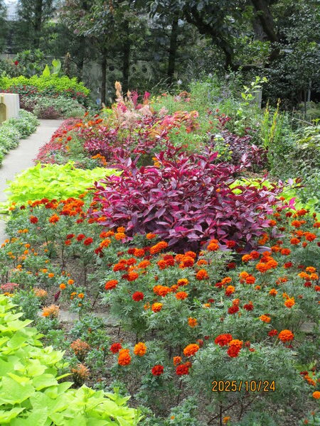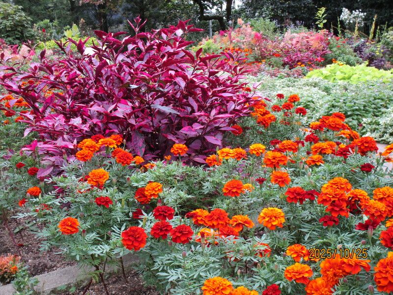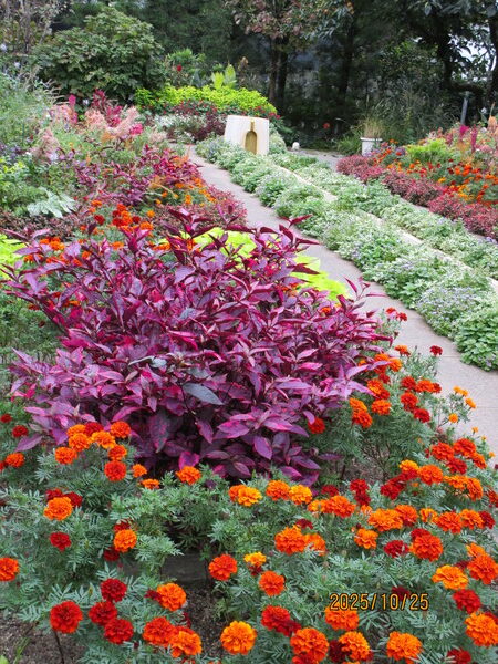 ハロウィンカラー 花壇 2025.10.28ぐっと秋も深まり、散策に気持ちの良い気候となりました。紫色のアルテルナンテラとオレンジ色のマリーゴールド。秋らしいコントラストが美しいです。ここ数年の百花百草の定番です。